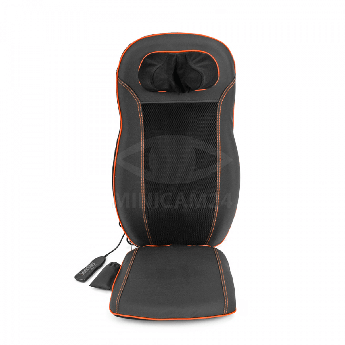 Накидка на автомобильное кресло из черного полиэстера со встроенными массажными роликами, вакуумными массажерами и элементами ИК прогрева. Управляется массажная накидка при помощи проводного пульта. Питание осуществляется от бортовой сети автомобиля или от сети 220 В через адаптер. Накидка крепится к креслу эластичными резинками. Применять ее можно в автомобиле непосредственно в дороге или дома, укрепив накидку на стул или кресло.
