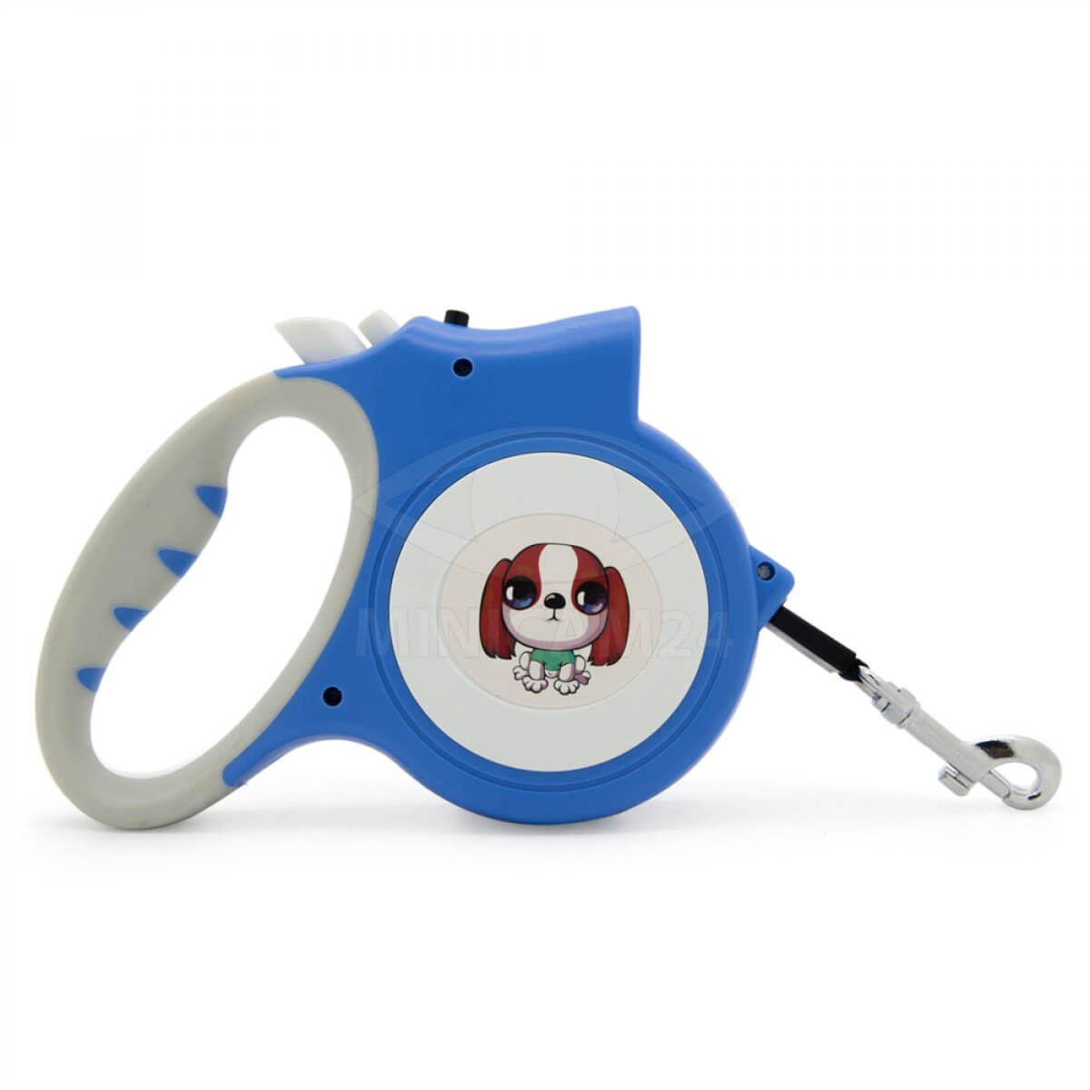 Поводок для выгула собак. Прочная лента из нейлона надежно удерживает животное, не путается в процессе использования. Предусмотрен механизм автоматического сматывания. Фиксация определенной длины осуществляется нажатием кнопки на корпусе. Предусмотрена удобная ручка. Дополнительно поводок-рулетка оснащен светодиодным фонариком.